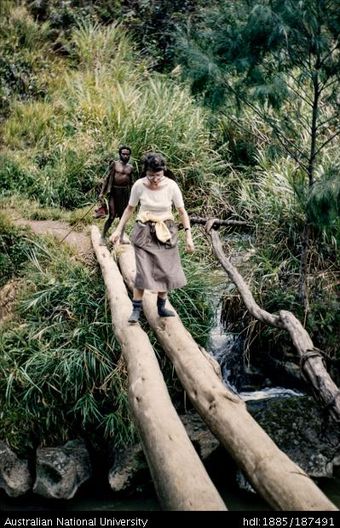 Pat crossing a bridge, below MapAustralian National University LibraryImage Papua New Guinea 1954 to 2019 Online -