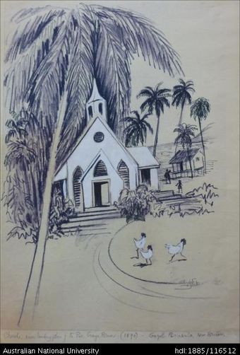 Church near landing place of the Rev George Brown (1890[?])– Gazelle Peninsula, New BritainAustralian National University LibraryImage Papua New Guinea 1970 to 2017 Online -