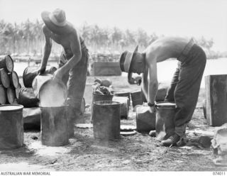MILILAT, NEW GUINEA. 1944-06-19. QX49313 DRIVER J.L. COSTAR (1) AND NX170473 CORPORAL H.R. KING (2) HEADQUARTERS COMMAND, 5TH DIVISION, AUSTRALIAN ARMY SERVICE CORPS, MEASURING FLOUR FOR ..Australian War MemorialImage Papua New Guinea Online