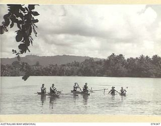 SIAR, NEW GUINEA. 1944-06-25. TROOPS OF D COMPANY, 57/60TH INFANTRY BATTALION ENJOY A PADDLE ON THE RIVER IN THEIR CANOES AND NATIVE LAKATOIS DURING A UNIT STAND DOWN PERIOD. IDENTIFIED PERSONNEL ..Australian War MemorialImage Papua New Guinea Online