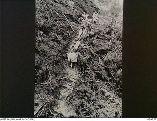 Ecclestone's Gap, Papua/New Guinea. 1943-07. Compressor parts being lowered down a slippery and dangerous section. Natives carried these parts sixteen miles (twenty seven km) in two daysAustralian War MemorialImage Papua New Guinea Online