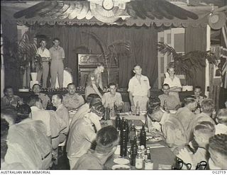 PORT MORESBY, NEW GUINEA. C. 1944. RAAF MEMBERS AT THE COMBINED DINNER IN THE OFFICERS' MESS. THIRD FROM LEFT IS AIR COMMODORE A. M. CHARLESWORTH AFC. ON THE STAGE ARE TWO ATTENDANTS WITH A ..Australian War MemorialImage Papua New Guinea Online