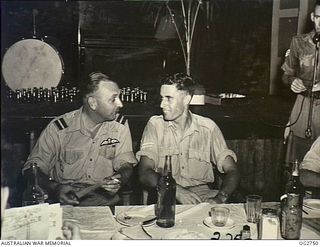 PORT MORESBY, PAPUA. C. 1944. AIR COMMODORE A. M. CHARLESWORTH AFC CHATS WITH A RAAF CORPORAL (UNIDENTIFIED) AT A COMBINED DINNER IN THE OFFICERS MESSAustralian War MemorialImage Papua New Guinea Online