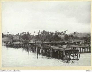 MILNE BAY, NEW GUINEA. 1944-07-05. A SECTION OF THE BAY FORESHORES VIEWED FROM THE DECK OF THE AUSTRALIAN TROOPSHIP, THE HMAT "ORMISTON". THE WHARVES IN THE FOREGROUND WERE COMPLETED BY AUSTRALIAN ..Australian War MemorialImage Papua New Guinea Online