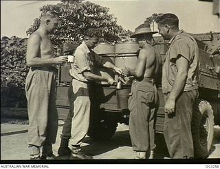 TOROKINA, BOUGAINVILLE ISLAND, SOLOMON ISLANDS. C. 1945-08. THE BOYS OF THE OPERATIONS ROOM STAFF OF NO. 5 (BOOMERANG) SQUADRON RAAF CAN SET THEIR WATCHES BY THE ARRIVAL OF THE "TEA-WAGON" EVERY ..Australian War MemorialImage Papua New Guinea Online