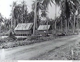 LUNGGA, GUADALCANAL, SOLOMON ISLANDS, 1944-02-29. THE ROAD INTO THE HEADQUARTERS CAMP OF THE DEPUTY SUPERVISING INTELLIGENCE OFFICER (DSIO), NAVAL INTELLIGENCE DIVISION, RAN, WITH TWO OF THE CABINS ..Australian War MemorialImage Online
