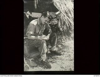 MADANG, NEW GUINEA. 1944-06-17. VX88633 LIEUTENANT H. COATES, 22ND INFANTRY BATTALION, WRITING HOME FROM HIS "DOOVER" (IMPROVISED SHELTER) AT THE AIRFIELDAustralian War MemorialImage Papua New Guinea Online