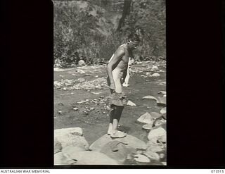 DUMPU VALLEY, NEW GUINEA. 1944-06-18. VX128013 SERGEANT G. J. BROWNING, MILITARY HISTORY SECTION, PREPARING TO TAKE A DIP IN THE RIVER AFTER DESCENDING SHAGGY RIDGE. A PATROL FROM 11TH DIVISION ..Australian War MemorialImage Papua New Guinea Online