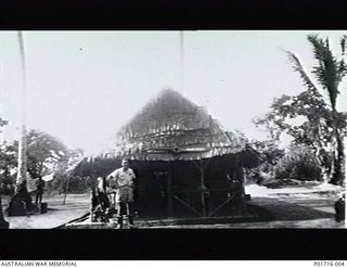 DOBODURA, NEW GUINEA. GRASS HUT USED BY MEMBERS OF NO. 1 AIR SEA RESCUE SQUADRON, RAAF, AND BUILT BY THE AUSTRALIAN NEW GUINEA ADMINISTRATIVE UNIT (ANGAU). STANDING IN FRONT OF THE HUT IS A NEW ..Australian War MemorialImage Papua New Guinea Online