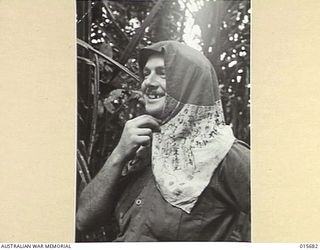 1943-09-14. NEW GUINEA. KOMIATUM RIDGE. CPL. FRANK YOUNG, OF PORT MORESBY USES A JAPANESE FLAG IN A MANNER WHICH ITS OWNER NEVER INTENDED. THE FLAG WAS FOUND AFTER THE JAPANESE HAD BEEN DRIVEN FROM ..Australian War MemorialImage Papua New Guinea Online