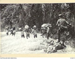 NEW GUINEA. UPPER RAMU VALLEY ADVANCE. A FORWARD POST AT WHICH PATROLS MAKE CONTACT WITH JAPANESE. THE RIVER, WHICH VARIES IN SPEED FROM 5-12 KNOTS, HAS TO BE CROSSED ABOUT THIRTY TIMES ON THE WAY ..Australian War MemorialImage Papua New Guinea Online