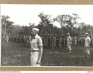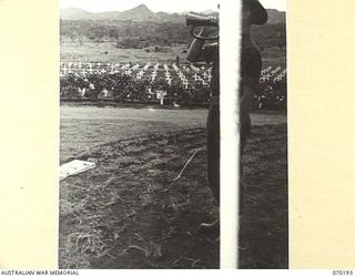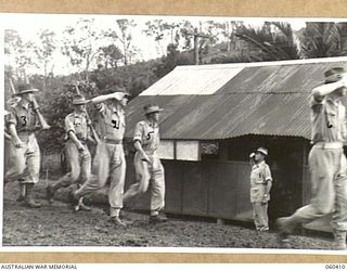 SOGERI, NEW GUINEA. 1943-11-20. STUDENTS MARCHING PAST THE OFFICER COMMANDING, SCHOOL OF SIGNALS, NEW GUINEA FORCE AS THEY MOVE OFF THE PARADE GROUND AFTER THE MORNING PARADE. SHOWN ARE: NX35052 ..Australian War MemorialImage Papua New Guinea Online