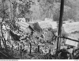OWEN STANLEY RANGES, NEW GUINEA. 1942-08-27. A NATIVE VILLAGE IN THE JUNGLE COUNTRY THAT IS THE BATTLEGROUND FOR AUSTRALIANS AND JAPANESE TROOPS IN THEIR STRUGGLE FOR CONTROL OF PAPUA. THIS PICTURE ..Australian War MemorialImage Papua New Guinea Online