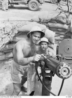 1942-11-06. SHOT OF AN AUSTRALIAN ANTI-AIRCRAFT BATTERY SOMEWHERE IN NEW GUINEA. THIS BATTERY IS MANNED ENTIRELY BY VICTORIANS USING GUNS MANUFACTURED IN A VICTORIAN FACTORY, AND THEIR BAG ENEMY ..Australian War MemorialImage Papua New Guinea Online