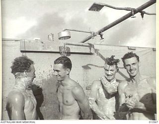 1942-11-14. PORT MORESBY. FOUR BEAUFIGHTER PILOTS TAKE A SHOWER AFTER RETURNING FROM A STRAFING ATTACK ON JAPANESE IN LAE AND SALAMAUA. THEY ARE FROM LEFT TO RIGHT:- F/LT. R. UREN (N.S.W.) F/O. J. ..Australian War MemorialImage Papua New Guinea Online