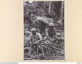 GAZELLE, NEW BRITAIN. 1945-11-23. JAPANESE TROOPS CONSTRUCTED A PRISONER OF WAR CAMP UNDER THE SUPERVISION OF 13 FIELD COMPANY. SHOWN, JAPANESE WEAVING COCONUT PALM LEAVES FOR USE IN THE ..Australian War MemorialImage Papua New Guinea Online