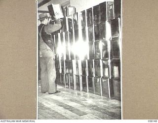 KENSINGTON, VIC. 1943-10-23. 25 LBS OF FLOUR BEING PACKED INTO EACH TIN FOR DESPATCH TO THE TROOPS IN NEW GUINEA AT THE FLOUR MILLS OF MESSRS KIMPTON & SONS. 2000 TINS ARE FILLED DAILYAustralian War MemorialImage Papua New Guinea Online
