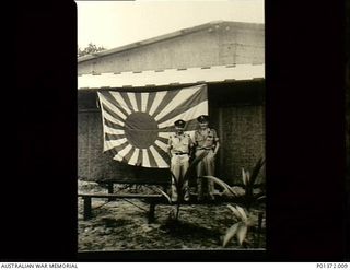KIRIWINA ISLAND. SOLOMON SEA. 1944-03-08. FLIGHT LIEUTENANT L. HASTWELL (LEFT) AND FLYING OFFICER E. ELLIS (RIGHT) STANDING BESIDE A JAPANESE RISING SUN FLAG HANGING ON A BUILDING, POSSIBLY THE ..Australian War MemorialImage Papua New Guinea Online