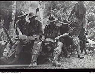 WONGINARA MISSION, NEW GUINEA. 1945-04-07. MAJOR K.M. MACKENZIE, OFFICER COMMANDING D COMPANY, 2/3RD INFANTRY BATTALION WITH HIS PLATOON LEADERS. LEFT TO RIGHT. CAPTAIN M.S. NORDSVAN, LIEUTENANT ..Australian War MemorialImage Papua New Guinea Online