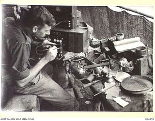 YAMIL 2, NEW GUINEA, 1945-08-01. SIGNALMAN F.S. TONKIN, 2/6 INFANTRY BATTALION, REPAIRING SIGNALLING EQUIPMENT WHICH HAS BEEN SENT IN FROM THE FRONT LINE FOR OVERHAUL OR REPAIR. HE IS WORKING ON A ..Australian War MemorialImage Papua New Guinea Online