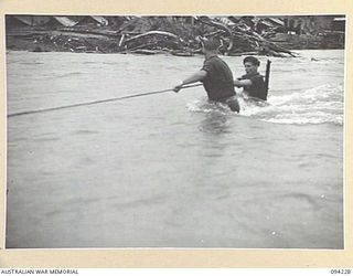 SOUTH BOUGAINVILLE, 1945-07-20. MAJ B. SHORT, MEDICAL OFFICER, 2 FIELD AMBULANCE (1), GOING TO THE RESCUE OF SGT R. DONALDSON (2), WHO GOT INTO DIFFICULTIES CROSSING A FLOODED RIVER ON A ROPE ..Australian War MemorialImage Papua New Guinea Online