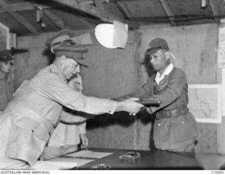TOROKINA, BOUGAINVILLE. 1945-09-08. LIEUTENANT-GENERAL (LT-GEN) S. G. SAVIGE, GENERAL OFFICER COMMANDING 2 CORPS, ACCEPTED THE SURRENDER OF ALL JAPANESE FORCES ON BOUGAINVILLE FROM LT-GEN M. KANDA, ..Australian War MemorialImage Papua New Guinea Online
