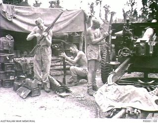 THE SOLOMON ISLANDS, 1945-04-24/27. MEMBERS OF AN AUSTRALIAN ARTILLERY UNIT CLEANING THEIR RIFLES ON BOUGAINVILLE ISLAND. (RNZAF OFFICIAL PHOTOGRAPH.)Australian War MemorialImage Papua New Guinea Online