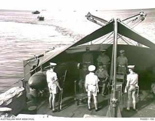 THE SOLOMON ISLANDS, 1945-08-20. HMAS LITHGOW, OFF MOILA POINT, WITH TWO JAPANESE OFFICERS ON BOARD MOVES AWAY FROM THE BARGE WHICH HAD DELIVERED THE JAPANESE FOR SURRENDER ARRANGEMENTS. (RNZAF ..Australian War MemorialImage Papua New Guinea Online