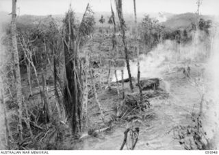 ULUPU, NEW GUINEA, 1945-07-09. FIRES BURNING FROM RAAF BEAUFORT AIR STRIKES VIEWED FROM THE FEATURE OCCUPIED BY 18 PLATOON, D COMPANY, 2/5 INFANTRY BATTALION, WHO PROVIDED COVER FOR THE ATTACK BY ..Australian War MemorialImage Papua New Guinea Online