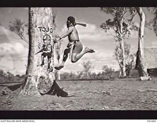 BISIATABU, NEW GUINEA. 1943-07-01. THE 1ST PAPUAN INFANTRY BATTALION INTERPRETATION OF A BAYONET CHARGE. HERE A NATIVE, CORPORAL MALAISA, IS CHARGING THE FIGURE OF A JAPANESE SOLDIER PAINTED ON A ..Australian War MemorialImage Papua New Guinea Online