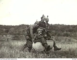 WAREO, NEW GUINEA. 1943-12-09. TROOPS OF THE 2/23RD AUSTRALIAN INFANTRY BATTALION, ENJOYING A BIT OF FUN AFTER THEY HAD CAPTURED THE AREA. SHOWN ARE: VX25000 CORPORAL L. B. HARPER OF ALBURY, VIC, ..Australian War MemorialImage Papua New Guinea Online