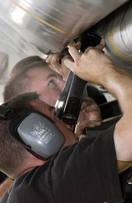 US Air Force (USAF) Weapons Loaders assigned to the 2nd Bomb Wing (BW), make final inspections on Conventional Air Launch Cruise Missiles, after loading them into the weapons bay of a USAF B-52H Stratofortress aircraft while deployed with the 7th Air Expeditionary Wing (AEW) at Andersen Air Force Base (AFB), Guam, during Operation ENDURING FREEDOMNational Archives at College Park - Still PicturesImage