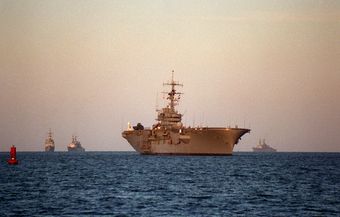 A starboard bow view of the amphibious assault ship USS GUAM (LPH-9) entering the roadstead upon returning from sea following the passage of Hurricane Felix out of the area. The Spruance-class destroyers USS DEYO (DD-989), USS ARTHUR W. RADFORD (DD-968) and USS JOHN ROGERS (DD-983) are following behind the GUAMNational Archives at College Park - Still PicturesImage