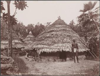 A man standing in front of a round house at Te Motu, Santa Cruz Islands, 1906 / J.W. BeattieNational Library of AustraliaImage Online