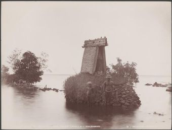 A man and child standing in front of the islet shrine at Tunduo, Java, Solomon Islands, 1906 / J.W. BeattieNational Library of AustraliaImage Online