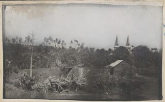 View in Papua New Guinea with two spires, one flying a red cross flag, 1914National Library of AustraliaImage Papua New Guinea Online