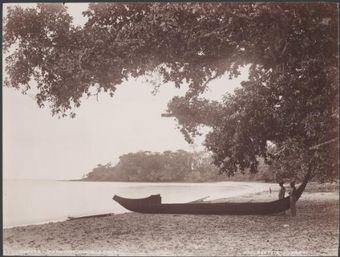 Two men standing next to a canoe on a Maravovo beach, Guadalcanar, Solomon Islands, 1906 / J.W. BeattieNational Library of AustraliaImage Online