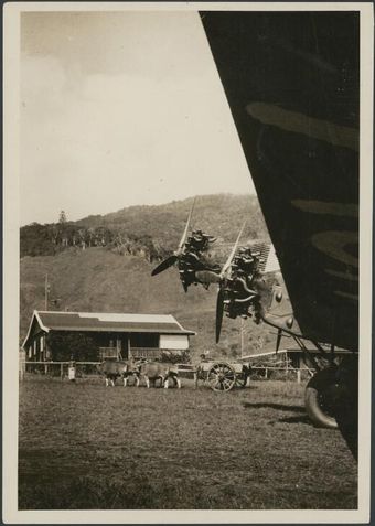 Bullock cart viewed from under a Fokker plane wing, Wau airfield, New Guinea, 1933 / Sarah ChinneryNational Library of AustraliaImage Papua New Guinea Online