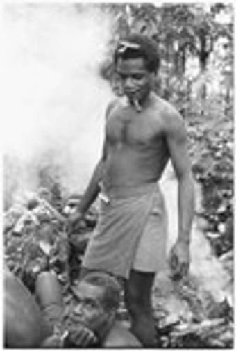 Unwrapping and eating the gwasu taro and coconut pudding, as part of desacralization ritual connected with mourningUC San Diego, Special Collections and ArchivesImage Solomon Islands