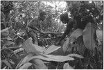 Pig festival, pig sacrifice, Tsembaga: in ancestral shrine, man kills pig with club, above ground ovens in backgroundUC San Diego, Special Collections and ArchivesImage Papua New Guinea