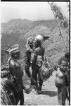 Pig festival, singsing, Kwiop: men in fur headdress and crimped leaf bustles, one holds packet of exchange valublesUC San Diego, Special Collections and ArchivesImage Papua New Guinea