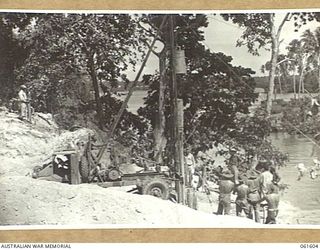 BUMI RIVER, FINSCHHAFEN AREA, NEW GUINEA. 1943-11-24. PILE DRIVER FRAME BEING TRUED UP IN PREPARATION FOR THE DRIVING OF PILES FOR A BRIDGE ACROSS THE BUMI RIVER BY ENGINEERS OF THE 2/3RD ..Australian War MemorialImage Papua New Guinea Online