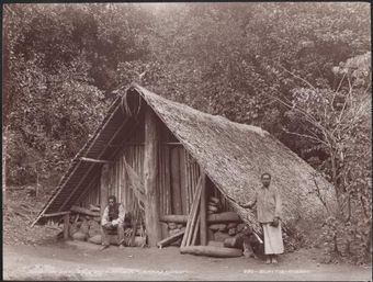 Two men at a house in Lakona, Santa Maria, Banks Islands, 1906 / J.W. BeattieNational Library of AustraliaImage Vanuatu