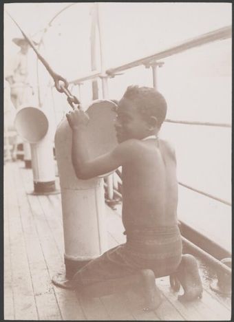 A Melanesian boy looking down the cabin ventilator on the Southern Cross, 1906 / J.W. Beattie