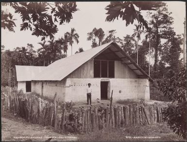 Man standing outside the church at Suholo, Ulawa, Solomon Islands, 1906 / J.W. Beattie