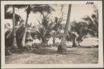 Hut surrounded by palms, New Britain Island, Papua New Guinea, probably 1916
