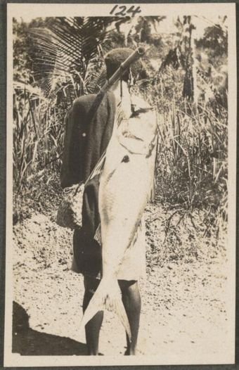 Young man resting on a log, New Britain Island, Papua New Guinea, approximately 1916