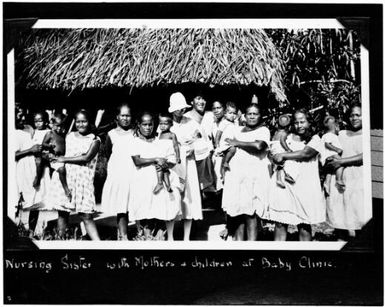 Nursing sister with mothers and children at a baby clinic, Nauru, approximately 1930s