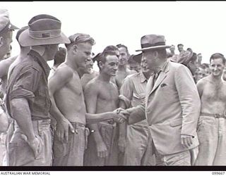 LAE AIRSTRIP, NEW GUINEA, 1946-01-27. THE HONOURABLE F. M. FORDE, MINISTER FOR THE ARMY, TALKING TO MEMBERS OF THE RAAF, ON HIS ARRIVAL AT THE AIRSTRIP FOR AN INSPECTION TOUR OF AUSTRALIAN UNITS IN ..