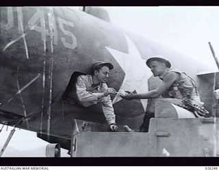 NEW GUINEA, 1942-08-11. THE CREW OF A 39TH INFANTRY BATTALION, AUSTRALIAN MILITARY FORCES, BREN GUN CARRIER PAY A CALL ON THE REAR-GUNNER OF AN AMERICAN B26 GIANT BOMBER AS IT STANDS BY ON A NEW ..